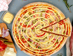 Русская пицца. Соус для пиццы, сыр Моцарелла, ветчина, салями, томаты, соус сырный, укроп.