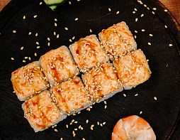 Креветки, огурцы, томаты, икра Масаго, соус Пармезан, соус Чесночный, кунжут, соус Унаги.