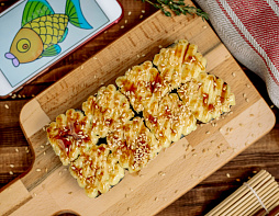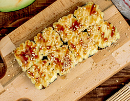 Лосось в кляре, омлет Тамаго, сливочный сыр, васаби, соус Тобико, соус Унаги, кунжут.