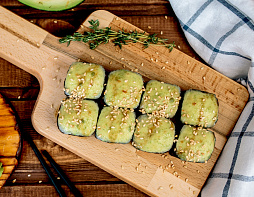 Креветки, авокадо, креветочный соус Фудзи, соус Унаги, кунжут.