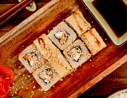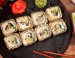 Курица копчёная, томаты, кляр, сухари Панко, сыр Маасдам, соус Унаги, кунжут. (Жареный ролл)