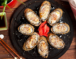 Мясо мидий, Маасдам сыр, соус Чесночный, соус Унаги, кунжут.
