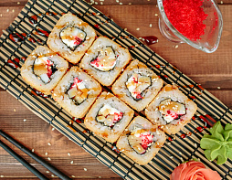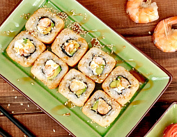 Креветка, сливочный сыр, авокадо, кляр, сухари Панко. (Жареный ролл)